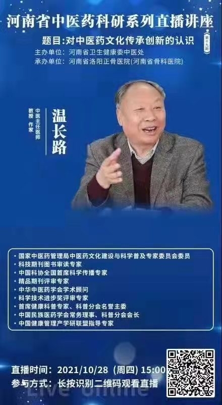 由河南省卫健委中医处主办的河南省中医药科研系列直播讲座第十九期将于2021年10月28日(周四)15时开讲。本期讲座,国家中医药管理局中医药文化建设与科学普及专家委员会委员、科技期刊审读专家、中国科协全国首席科学传播专家温长路教授,以《对中医药文化传承创新的认识》为切入点,进行学术分享。长按识别图中二维码可观看直播,欢迎大家收看!