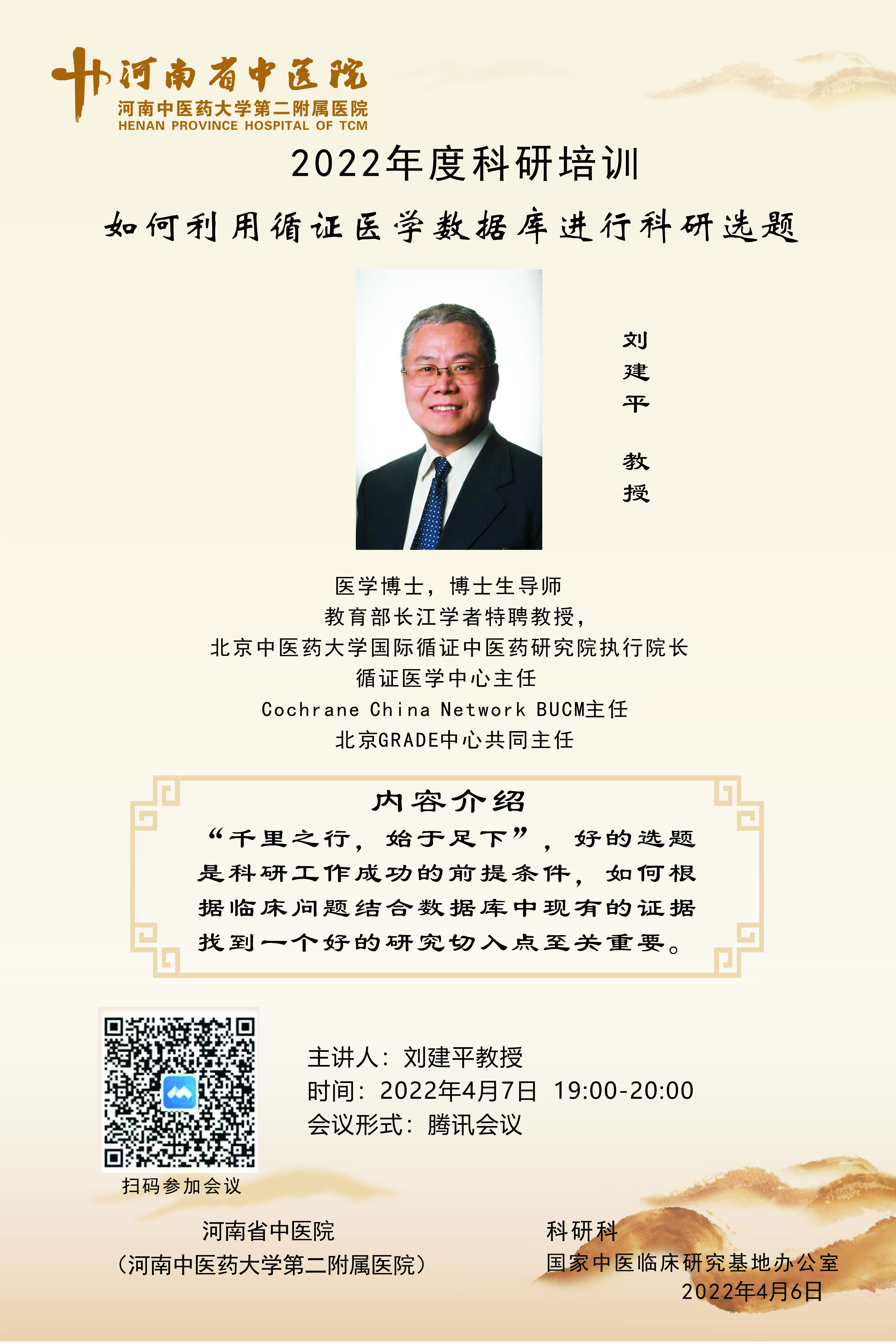 各位老师好!4月7日(周四)晚7:00举办线上科研培训,主题“如何利用循证医学数据库进行科研选题”,主讲专家:北京中医药大学刘建平教授。扫描海报二维码即可观看直播,欢迎大家参与。