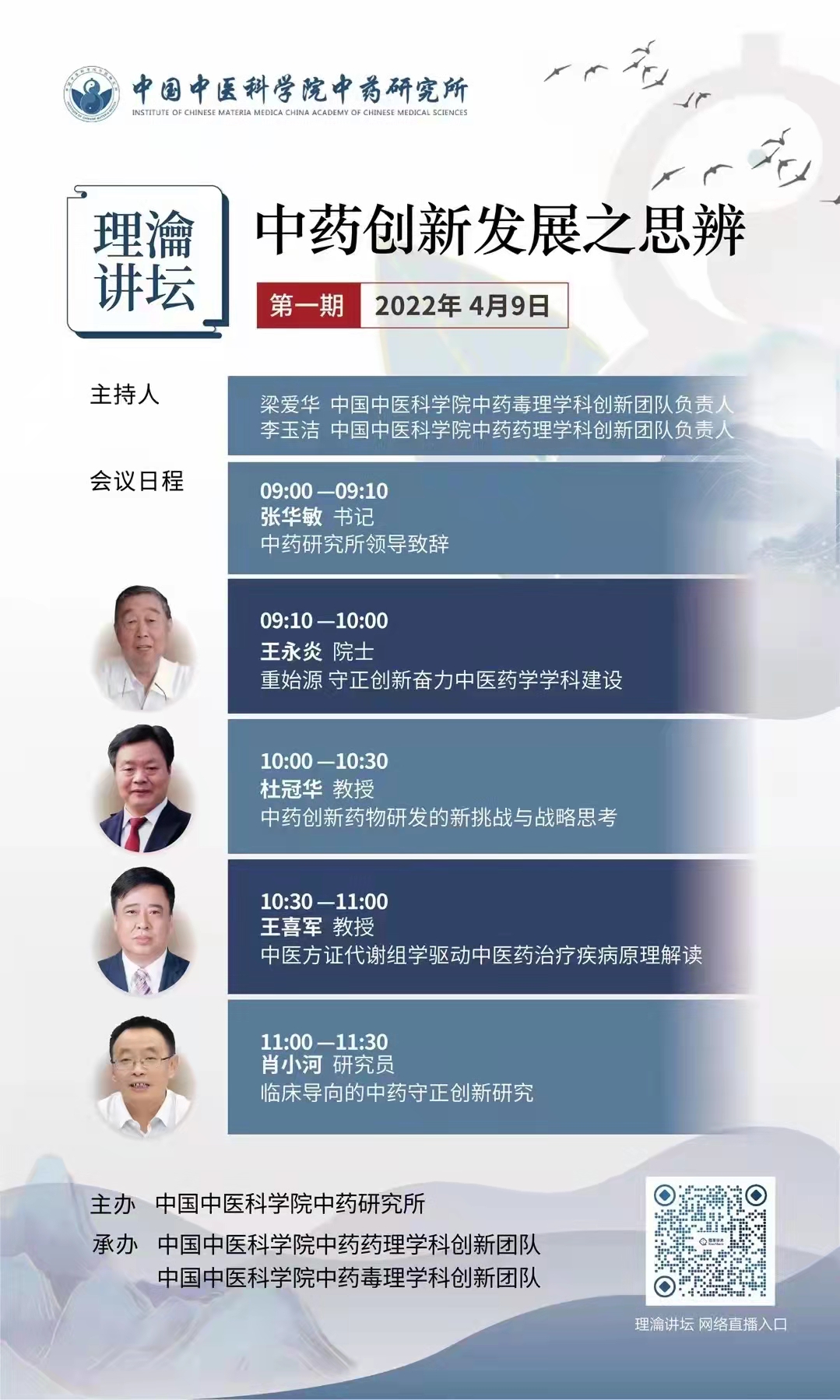 中国中医药科学院中药研究所主办的理瀹讲坛(第一期)中药创新发展之思辨系列讲座将于4月9日(周六)9:00-11:30进行在线学术分享,具体时间、内容和参加方式请详见下方海报,欢迎大家参与。