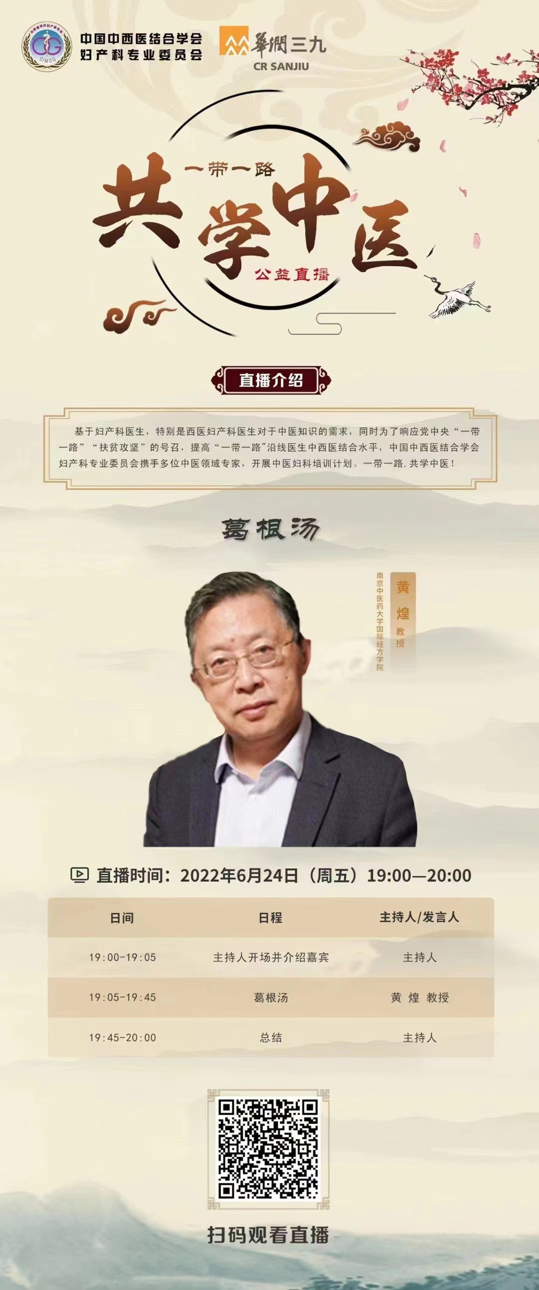 【一带一路,共学中医】系列讲座将于6月24日直播!讲座名称:《葛根汤》的临床应用;时间:6月24日(周五)19:00-20:00;主讲专家:南京中医药大学黄煌教授。扫描海报二维码即可观看直播,欢迎大家参与。